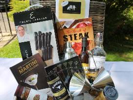 For a gourmet evening of steak and cocktails at home! Emeril Lagasse 10 piece block set, The Martini Cocktail book, The Gourmet Collection Pepper Steak Spice Blend, Kinders Buttery Steakhouse Seasoning, Filthy Pimento stuffed olives, Filthy Blue Cheese stuffed olives, stainless steel martini picks, RSVP Endurance martini glasses, cocktail shaker, Dirty Sue olive juice, The Book of Steak, Stateside Vodka, and Rastelli's Gift Card.