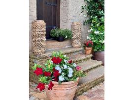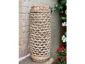 Pair of Large Pottery Barn Rattan Lanterns with Hurricane Lamps. Place a candle inside these tall, warm lanterns and let them brighten a console, entryway, or mantel. These lanterns are crafted from very smooth, natural brown and beige rattan ropes woven in an open-weave frame. They can even be hung from a decorative hook. Another easy option is to place small strings of battery operated lights inside. 26"H X 9 1/2" W.
