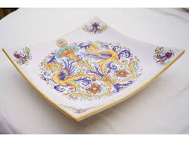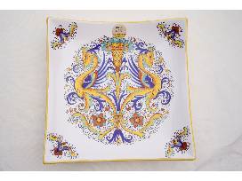 Italian Deruta Pottery - Square Platter. This unique square dish is perfect for everything from pasta to fish to risotto. The Ricco Deruta Collection features colorful, vibrant hand crafted pottery with the classic Italian Ricco scroll motif that dates back to the 14th century. Platter measures 13 1/2" X 13 1/2". Pairs beautifully with the serving bowls (#403) and rectangular serving tray (#405).