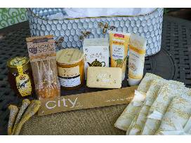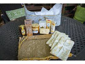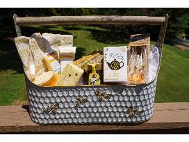 Hammered Metal Bee Basket with Placemats and Napkins. Farmhouse-style, large hammered metal bee basket with wooden handle. Includes a variety of items to brighten your day--burlap placemats, adorable napkins, an Ivy Botanics candle, Burt's Bees lotion, Burt's Bees cleansing cream, Langnese honey, Let it Bee soap, ginger-honey tea, and of course, honey spoons. Basket measures 21 1/2"X 17" X 7"