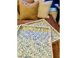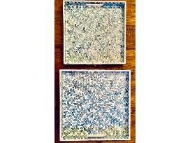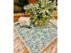 Handmade Ottoman trays with a wood frame and unique shell surface treatment for a durable and decorative tray set to display, store or transport your favorite things. Bring the warmth of shell, wood, and coastal style into your home. Each tray measures 14"X14"(Coasters and plant in photos not included)