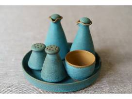 Cruets, salt, and pepper set made in Rum-Maqu, Chile. Add these charming, authentic cruets to your kitchen to lend the spice that only handcrafted items can. Plate is 7 1/2"D; cruets are 4 1/2"H