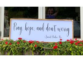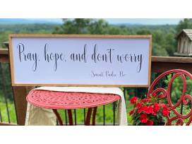 Saint Padre Pio's Famous Quote "Pray, Hope, and Don't Worry" presented as eye-catching oversized art with attractive font and sturdy, rustic, dark wood frame. These words to live by should be in every Catholic home and office.