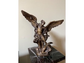 This statue depicts a scene from the Book of Revelation, which describes a "war in heaven" between angels led by the Archangel Michael against the fallen angels led by "the dragon", or Satan, who are defeated and thrown down to the earth.
