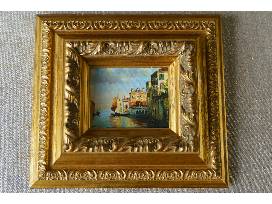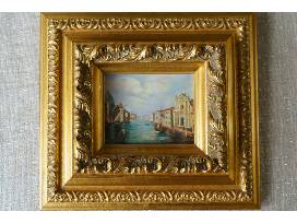 An elegant pair of Italian oil paintings depicting the canals of Venice. Picture size is 4 1/2" by 3 1/2". Framed size is 10" by 11".