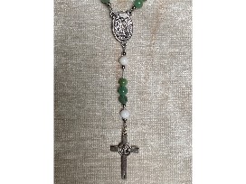This beautiful green rosary has a St. Benedict crucifix, a St. Michael Guardian Angel centerpiece, jade Hail Mary beads with river shell Our Father beads.