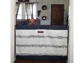 The Stair Barrier Wall to Wall Single Panel Swing Gate features a hand-constructed fabric slipcover on the exterior and an aluminum black frame that features a latch system that allows for one-handed operation. It installs at angles up to 30 degrees allowing the location of a stud when mounting on drywall. The Stair Barrier Wall to Wall eliminates children's view of the stairs and the temptation to climb, and helps the gate blend seamlessly into a home's décor.