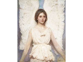 Abbott Handerson Thayer (1849-1921) is recognized today for his ethereal angels, portraits of woman and children, landscapes, and delicate flower paintings. Angel is both a portrait of his daughter Mary at age eleven and an allegory of hope and spirituality. Thayer manipulated the paint with brooms, scrapers, his fingers, and even a paint tube to achieve his effects.