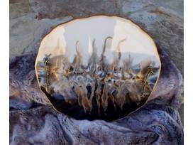 This beautifully handcrafted tray by designer Chrys Moore can be used as a vanity or serving tray, table centerpiece, or candle display. It is made with heat and scratch resistant epoxy resin, pigment paste, gold leafing, mica pigment powder, and has elegant gold handles.
