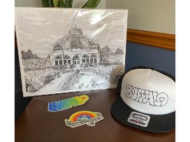 This raffle item is an 11x17 print of The Botanical Gardens, a Buffalo snap back hat and 2 CWM stickers based on Casey's public art installations.