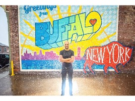 Casey William Milbrand is a Buffalo-based artist primarily focused on large-scale murals, pen and ink illustration, and interactive sculptures. With each project, Casey strives to re-define a public place and create room in which to play and experience the city in new ways. In 2016, Casey unveiled the Queen City's iconic "Greetings from Buffalo" mural, which has become the go-to place for tourists and residents alike who are looking for the perfect selfie to show off their Buffalove. His other colorful murals include the "Lookin' Good" mural on Hertel Avenue, the "As Is" PRIDE mural at D'Youville College, and the "Let's Fall in Love" mural on Old Falls Street in Niagara Falls, USA.