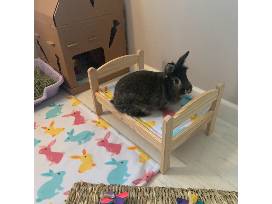 Wood Bed with Fleece Bed Pad. Buns love beds! Add the cute and soft fleece pad and watch your rabbit relax! Also includes a $20 BunnyBunchBoutique.com gift card.