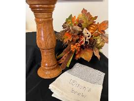 Bring fall charm into your home with an in home wine tasting from HolyField and this gorgeous solid oak candle holder, autumnal cornucopia in wicker horn basket, and handmade Halloween hand towel!