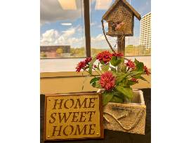 Sip and relax at home with a wine tasting for two with keepsake glasses, and make it cozy with this charming wooden birdhouse and planter with metal and wood Home Sweet Home!