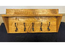 Bring that Farmhouse style home with this functional beautiful oak shelf with sturdy black metal hooks and an adorable plaid pumpkin, small shelf and display board, and a sewing themed handmade art collage piece to decorate your kitchen or any room in your house!
