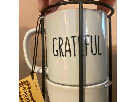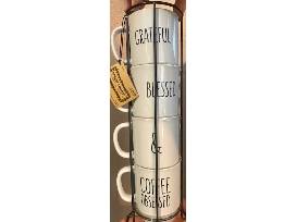 4 - 14OZ WHITE COFFEE MUGS STACKED IN A CUTE IRON TOWER WITH BLACK LETTERING