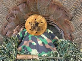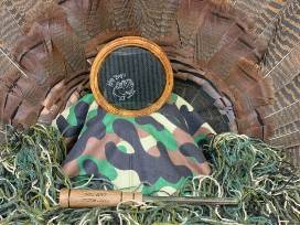 Hand Turned Caribbean Rosewood pot call. Glass over carbon fiber and a Hand turned Walnut Striker with a camo daymondwood striker dowel.
