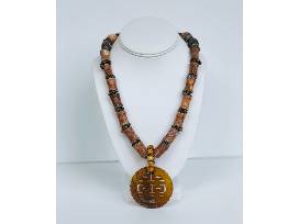 If it's not the right weather for a scarf, layer on a brown beaded pendant necklace from Arizona artist/jeweler Jo Whitten. This stunning piece features a Jade medallion.