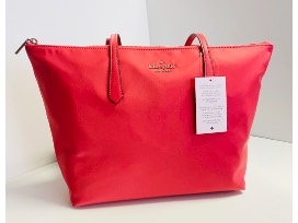 Tote, nylon with leather trim and handles. Coral color.