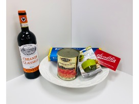 - Pasta Bowl, Italian Pasta, Garlic Chopper, Can of San Marzano Tomatoes, and a bottle of Chianti.