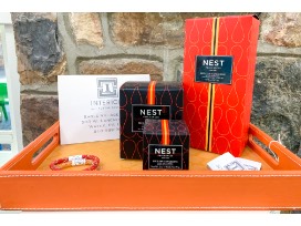 Spruce up your interior with treasures from Interiors for the Home! Gift basket includes Nest Reed Diffuser, Nest Small Candle, Nest Large Candle, beautiful leather and lacquer orange tray and a set of two on-trend beaded bracelets.