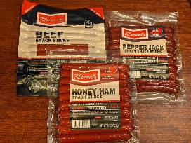 - Klement's Snack Sticks, real hardwood smoked sausages