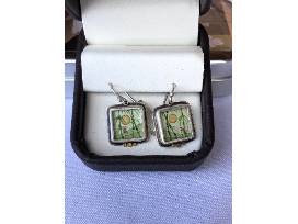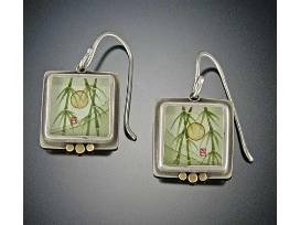 Symbolizing strength, grace, and longevity, these bamboo earrings feature original acrylic paintings on watercolor paper covered with a clear glass crystal, set in sterling silver bezels, and accented with three tiny 22k gold dots. Paintings measure 1/2 inches across. By designer Ananda Khalsa.