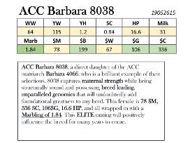 ACC Barbara 8038, a direct daughter of the ACC matriarch Barbara 4066, who is a brilliant example of their selections. 8038 captures maternal strength while being structurally sound and possessing breed leading, unparalleled genomics that will undoubtedly add foundational greatness to any herd. This female is 78 $M, 336 $C, 106$G, 16.6 HP, and all wrapped in with a Marbling of 1.84. This ELITE mating will positively influence the breed for many years to come.