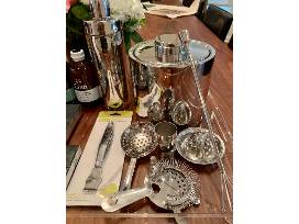- CB2 24"x14" Acrylic Tray, CB2 Column Shaker and Ice Bucker with lid, with assorted tools