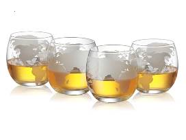 A bottle of Blanton's Original SIngle Barrel Bourbon, and a set of 4 globe etched whiskey tumblers.