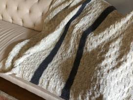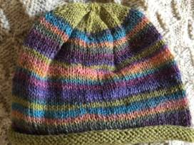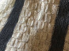 Knitted baby blanket in ecru with gray shading and speckles basketweave stitch and contrasting gray garter stitch accent stripes. 36" x 49". Reversible (there is no "wrong" side). Machine wash on delicate cycle in cold water and line dry or on towels. Knitted baby hat in baby alpaca, self-striping in 8 colors. Soak in cold water w/ Woolite and dry on a towel. Generously created and donated by Karen Byers.