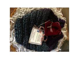 Handmade scarf (blue and purple) created with love & prayers by members bo St. Mark's Yarns of Compassion. Wear it with a beautiful diamond necklace donated by Helen Ostman.