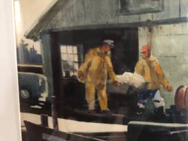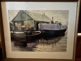 1Water colored painting of boats in a harbor (untitled) by Phil Austin. Framed picture is 38 ' * 31". About the Artist: Phil Austin (1910 - 2004), an American Water Color Society member, was active/lived in Wisconsin, Illinois. Phil Austin was known for his watercolor landscape and marine paintings. He was also a teacher at Wheaton College from 1963 to 1970 and worked as a free-lance artist in Chicago from 1950 to 1966. Austin earned a BA degree from the University of Michigan in 1933. He was a member of the American Watercolor Society, the American Artists Professional League, and the Academic Artists Association. He was featured in the October, 1971 issue of "American Artist" magazine. Phil Austin died on February 12, 2004, at his home in Ellison Bay (Gills Rock), Wisconsin. Generously donated by the Helgren Family. Provenance Helgren Family.