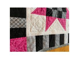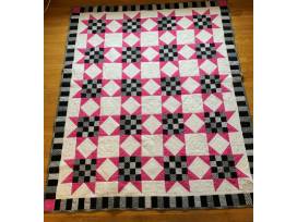 1Pink, black, gray and white star quilt is 88" x 72", full size, with gray backing. Created by Ellen Montgomery.