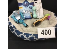 Includes: dog bed, brush, blue buffalo treats, harness, and toys