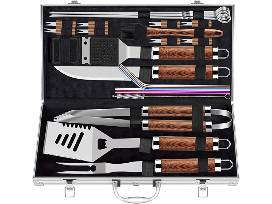 - MUST-HAVE ESSENTIAL BBQ TOOLS: Essential starter set for barbecue lover, This grill set contains everything you need for all your BBQs: 1* Long handled tongs, 1*Multi-purpose spatula, 1*Grill fork, 1*Sharp Knife,1*Basting brush,1*Cleaning brush with scraper,1*Extra cleaning brush head, 4*BBQ skewers, 8*Corn holders,1*Reusable straw sets(2*Rainbow straw,2*Silver straw,1*Straw cleaning brush), 1*Aluminum case