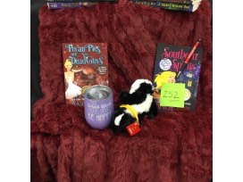 Curl up with your next mystery/romance series by local author, Angie Fox. This package includes the first 11 books of the Southern Ghost Hunter mystery series, skunk plush, pen, plush throw blanket, and wine tumbler.
