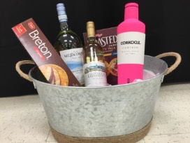 This package includes the galvanized tub, pink Corkcicle wine canteen, bottles of wine, sausage, and crackers for a perfect outdoor cocktail hour.