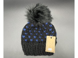 Black and royal blue knit with black fuzzy pom. 20% wool, 80% acrylic