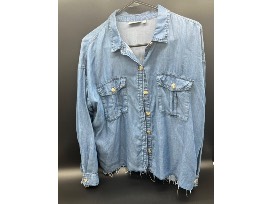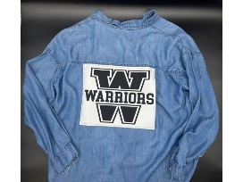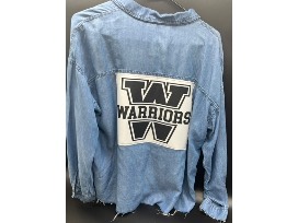 The Vintage Fern has donated the cutest Warrior Jersey patch on a super silky lyocel denim large button up, raw edge, button up shirt. Who says you can't be a trendy dressed fan?