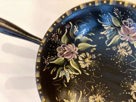 "A Handle on Education"- originally designed and hand painted decorative wooden bowl by Heather Duininck. Created especially for the BPSF BIG EVENT 2022! Inspired by the "4 As" : Academics, Activities, Arts, and Athletics. This 8 inch, handled shallow wooden bowl is adorned with Bavarian influenced folk art. Features a black background with metallic gold trim. Includes blues, reds, greens, and warm whites. Acrylic paint with glossy finish and protective wax coating. (Included as a small bonus are two hand painted wooden clothes pins.)