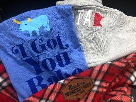 Explore Brainerd Lakes Red and black plaid snuggly lap blanket, Large grey Brainerd Minnesota pocketed joggers, and "I Got You Babe" Bella Canvas shirt XL