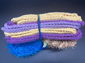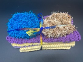 This bundle includes: 2 scrubbies (1 blue and 1 brown), 3 dish cloths (2 purples, 1 yellow), and 2 potholders (one yellow and purple and one yellow)
