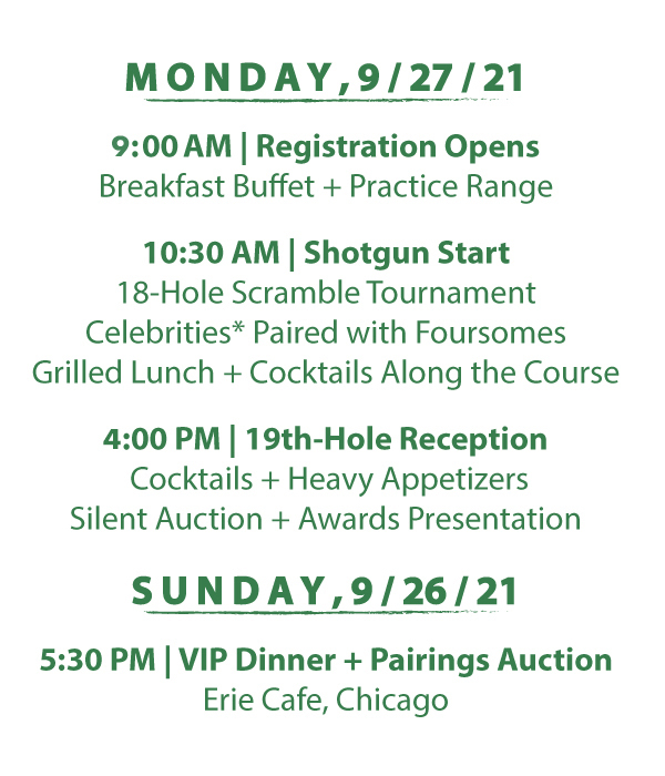 The Larry A. Pogofsky All-Star Challenge historically features a celebrity softball game, home run derby, and kids' baseball clinic with Chicago's biggest sports legends. This year's event is moving to "the greens." Golfers will enjoy 18-holes with a celebrity*, grilled lunch and cocktails along the course, a 19th-Hole Reception with cocktails & heavy appetizers, and more. The All-Star Challenge kicks-of with a VIP Dinner & Pairings Auction on Sunday, September 26th, where guests will mingle with celebrities and bid on a star who will join their golf foursome.