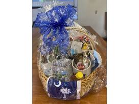 In the true spirit of southern hospitality, this basket is overflowing with South Carolinian-style treats. Included you will find: copies of Southern Living and Taste of the South magazines; a Charleston Christmas Ornament; a South Carolina tea towel; 2 South Carolina mugs and coasters; Charleston Tea Garden Loose Earl Gray Tea; 82 Queen Street She Crab soup mix; Charleston's own Shrimp Cheese Grits mix; Geechie Peachie Cobbler mix; praline pecans; Charleston Red Rice mix; Charleston's Own Key Lime Cookies; Caroline Honey Bee honey; 6 Charleston Chew candy bars; and a Charleston 2023 Calendar. That's sunshine and southern style to last through a long winter ahead! Better bid now so you don't miss it!