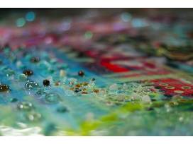 Ingredients on stretched canvas include resin, acrylic paint, broken glass, broken mirror, glitter, glue, gemstones, quarts, turquoise, tigers eyes, star confetti, agate, permanent marker (metallic), collage (magazine), paint marker, and beads.