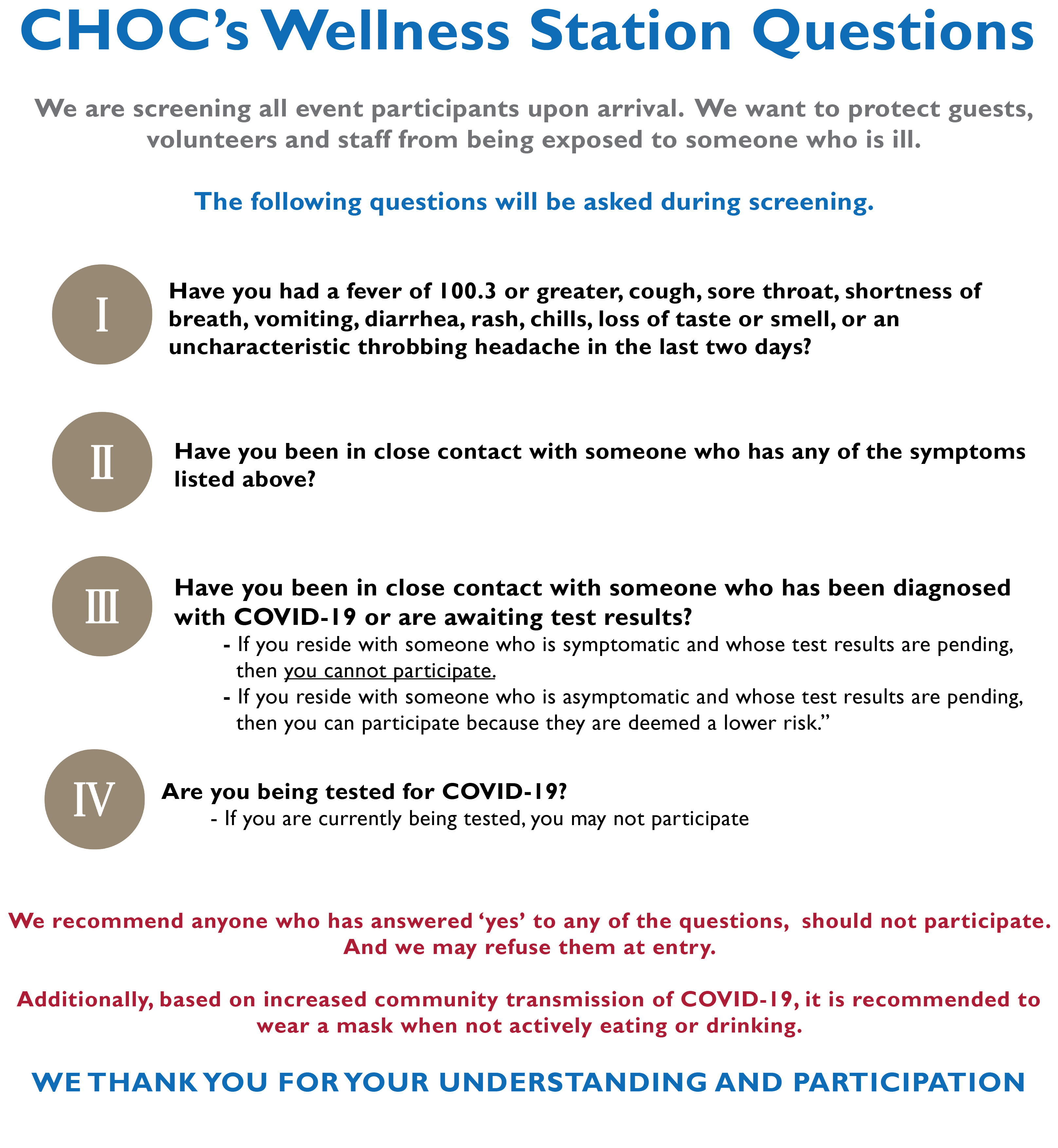 To protect guests, volunteers, and staff, CHOC Foundation has implemented safety precautions, as recommended by the Centers for Disease Control (CDC), to reduce the spread of COVID-19. If you are experiencing symptoms of COVID-19, such as: feeling ill, fever, cough, shortness of breath, or loss of taste or smell or have had exposure to someone who has had COVID-19 within the last 14 days, you are excluded from physically attending Unidos Por CHOC Event ("Event").