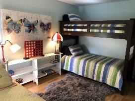 - Comfortably sleeps 8. There is a master "Captain's Quarters" room with a king bed, a guest room with a queen bed and a singles/kid friendly bedroom with bunkbeds and a trundle bed that offers a total of 4 twin beds.