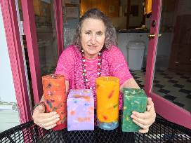 Candles are available in a wide variety of colors and hues (jewel tones and pastels). When you make a candle purchase, you'll be asked to enter your top two color preferences and we'll do our best to match your request. If you don't have a preference, please say "no preference". When ordering more than 1 of the same size candle, please indicate preferences for each candle. Average sizes are 2"x4", 3"x5" and 3"x7.5".