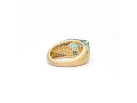Embark has designed a one-of-a-kind ring with meaningful details. This dome ring features a very unique green tourmaline stone in the center, which is a stone that warms the heart and helps one find rejuvenating energy.